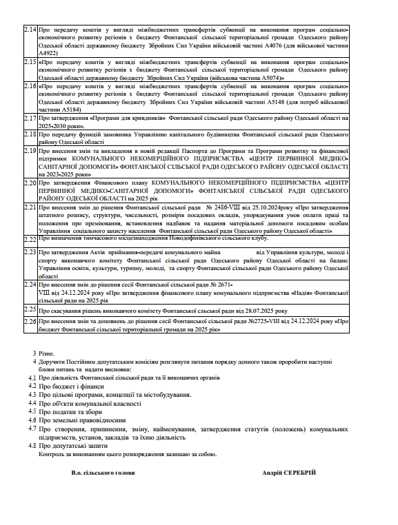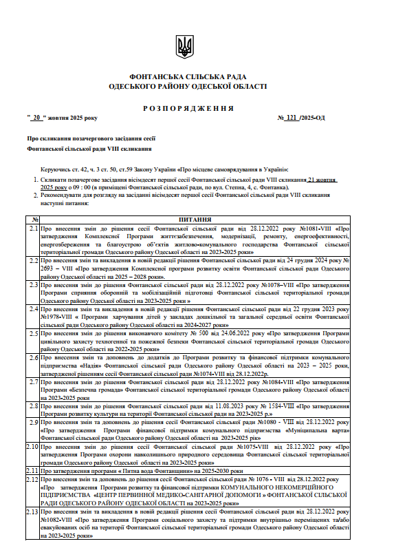 Про скликання позачергового засідання сесії Фонтанської сільської ради VIII скликання