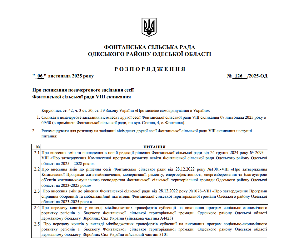 Про скликання позачергового засідання сесії Фонтанської сільської ради VIII скликання