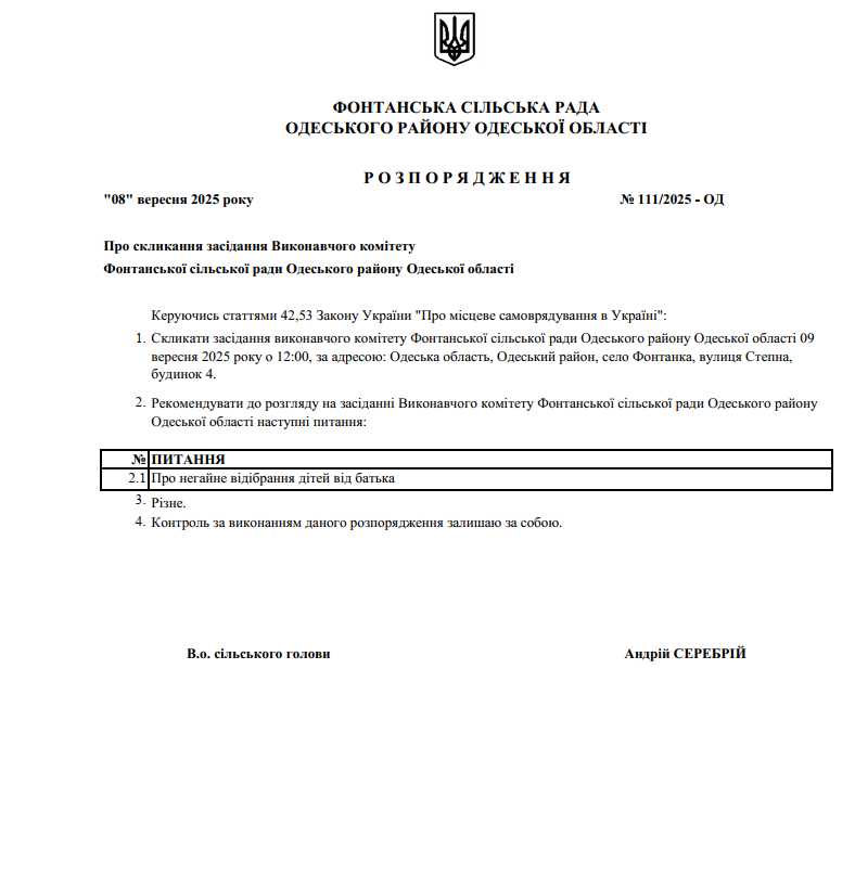 Про скликання засідання Виконавчого комітету Фонтанської сільської ради Одеського району Одеської області